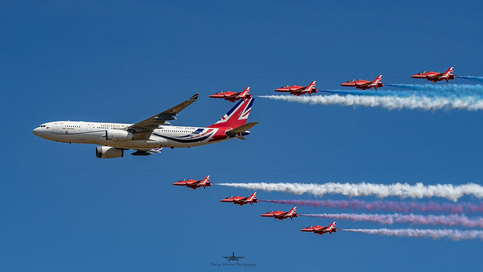The RAF Red Arrows and their A330 Voyager special colour scheme made an excellent pass at the RIAT 2022, The Red Arrows are the aerobatic team of the Royal Air Force and have been thrilling audiences around the world with their daring and precise manoeuvres. The A330 Voyager is an advanced multi-role tanker transport aircraft and has recently been painted in the distinctive colours depicting the United Kingdom. The public will have the opportunity to get up close to the aircraft and the Red Arrows team and to witness the incredible display of aerial skill and precision.